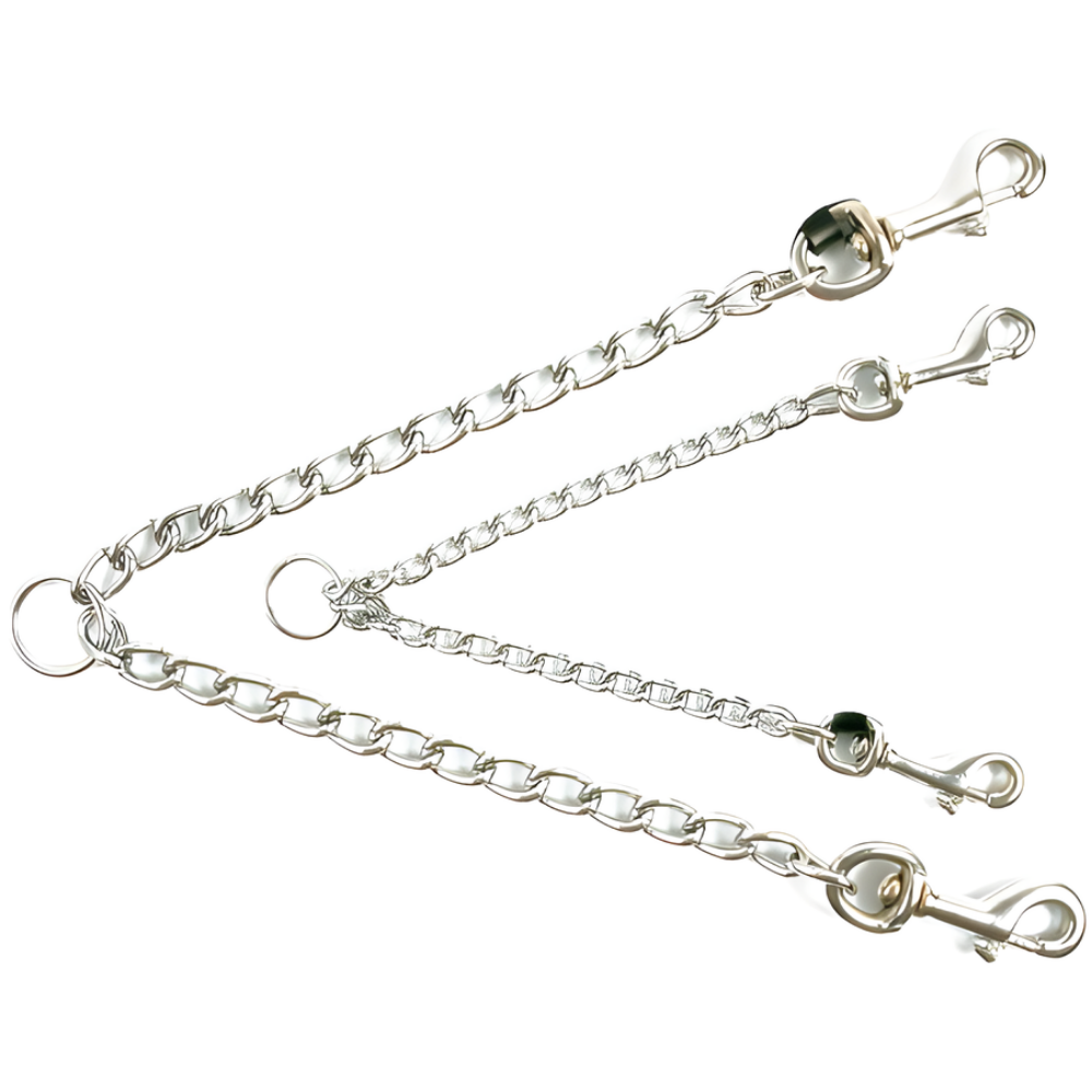 Acoplador cromado para correas que permite llevar dos perros. Tamaño 15 cm.